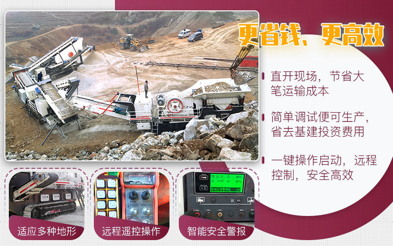 大型磕石制砂一體機是通過輪胎式或履帶式車架與鄂破、反擊破、錘破、圓錐破、制砂機、振動篩靈活配置,整體搭配緊湊,油電兩用,配有PLC智能電控箱,可遠程控制,根據(jù)客戶的實際生產狀況不同,配置方案多種多樣,比如以下客戶的方案。